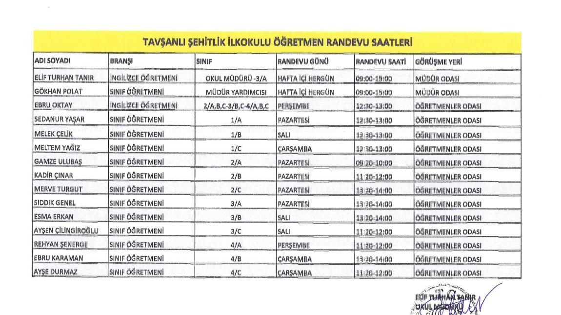 Tavşanlı Şehitlik İlkokulu Öğretmen -Veli Görüşme Saatleri